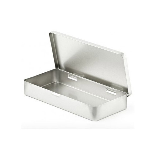 Eckige Blechdose mit Scharnierdeckel.
