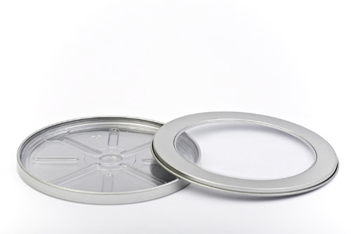 Medienverpackung für CD/DVD oder Blu-ray Disc aus Weißblech mit Sichtfenster im Deckel und schwarzem Plastik-Inlay im Boden