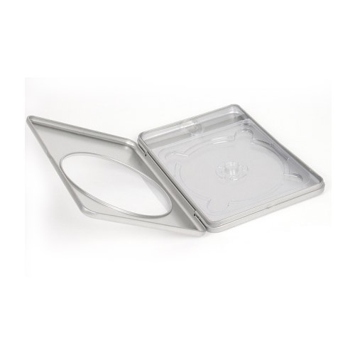 Medienverpackung für CD/DVD oder Blu-ray Disc aus Weißblech mit Sichtfenster und transparentem Plastiktray.
